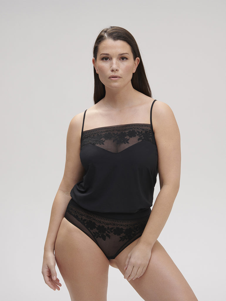 Bodysuit in crepe and recycled lace.