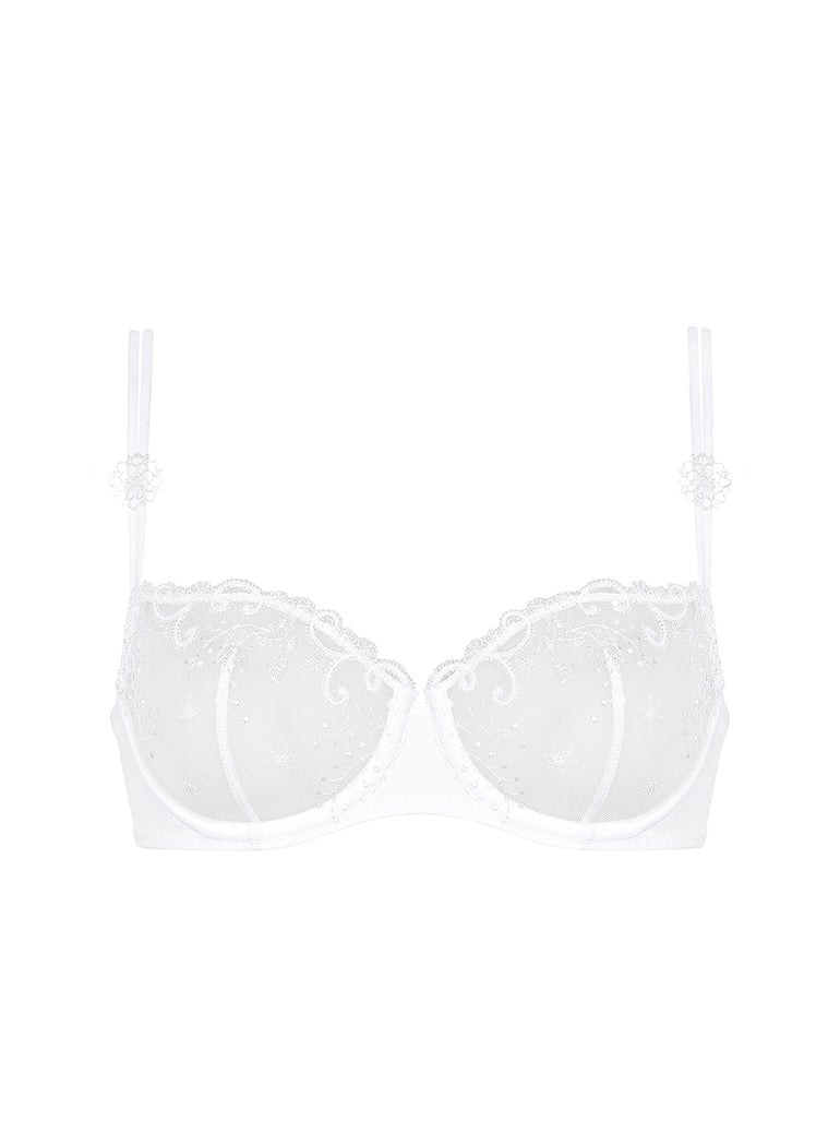 Embroidered half-cup mesh bra with guipure lace and underwire.